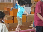 と遊戯室に誘ってくれました。行ってみると,大人の手を全く借りず,自分たちで巧技台を組み合わせて体を動かして遊べる場をつくっていました。