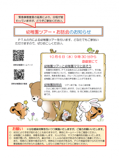 10月6日(水)に幼稚園説明会をします。今回は,現役の幼稚園ママさんによる『幼稚園ツアーと幼稚園ママと話そう』です。深草幼稚園のこと,幼稚園に通っている保護者の方から直接,いろいろ聞いてみませんか?どなたでもご参加いただけますので,当日お越しください。