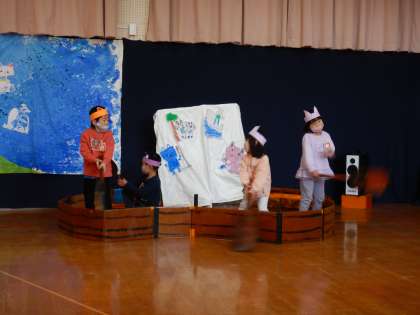 劇遊び『15ひきのねこと大きな魚』では,絵本『11ぴきのねこ』のお話の世界にイメージを膨らませながら,ねこだけでなく,オリジナルの登場人物,恐竜やペンギンなどになりきって遊びました。またストーリーの中に,この一年間楽しんできた遊びや生活も取り入れることで,普段の遊びと変わらない,いきいき,のびのびとして遊ぶ姿が見られました。
