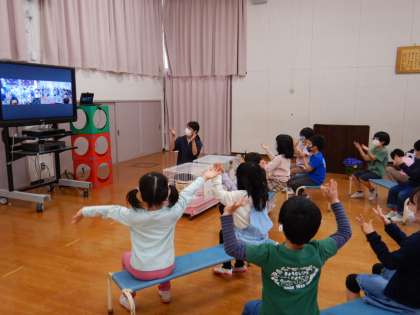 本当は,親子で集ってお楽しみ・・・の時間をもちたがったのですが,残念ながら今はそれが叶いません。そこで,そら組が,お家の人に見てもらいたかった,たる太鼓,合奏,こま遊び,縄跳びを楽しむ様子を,リアルタイムで,各ご家庭にオンラインで配信しました。降園時「かわいかった!」「みんな大きくなった!」と保護者の方からもお話いただきました。