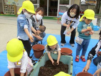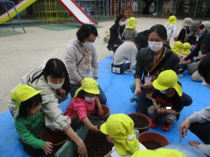 自分の植木鉢に土を入れて,小さなかわいい種を三個ずつ植えました。