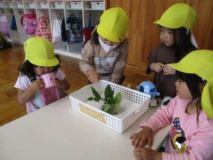滑り台で踏切ごっこをして滑ったり,にじ組のお友達が持ってきてくれた青虫をみんなでジーっとながめたり・・・