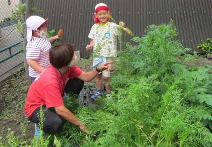 昨年度から育ててきたニンジンを,今日は5歳児そら組全員で収穫しました。