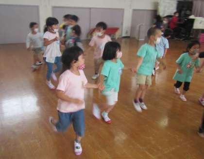 ピアノに合わせて遊戯室の中を散歩しながら,ピアノの音が止まったら自分の幼稚園きょうだいを探す“幼稚園きょうだいミッケ”の遊びをしました。最初はよく見て探していましたが,次は幼稚園きょうだいの名前を呼んでみようということになりました。どんなふうに呼んでほしいか,お互いに伝えあいました。そら組がにじ組の弟・妹の名前を呼ぶ番,にじ組がそら組のお兄さんお姉さんの名前を呼ぶ番など,代わり合って遊ぶことを楽しみました。