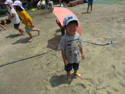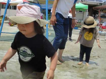 今日の未就園児ぷちひよこ組は,ひよこ組や在園児に混ざって,水遊びや泥遊びを満喫しました!