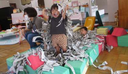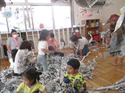 破いた新聞紙でプールを作って,キャーキャー喜んでいる姿がとっても可愛かったです。