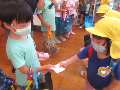 ひよこ組の子どもたちは,なくさないようにおうちの人に渡して,今朝大事そうに手に握りしめて,登園してきました。