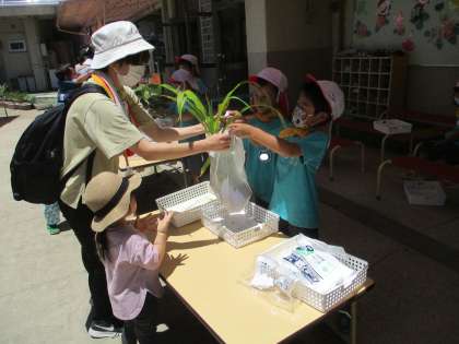 園庭では,そら組の子どもたちが育てた苗を,そら組のお兄さん,お姉さんに案内してもらい,苗を選び,持ち帰ってもらいました。