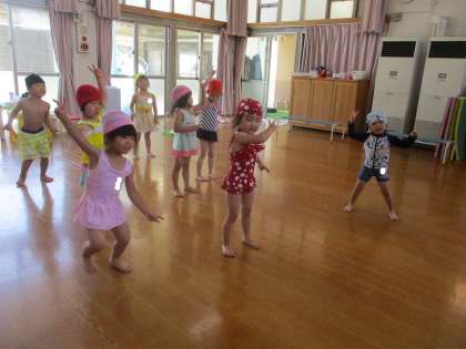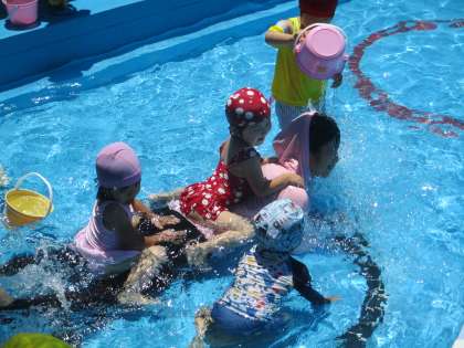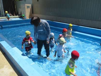 最初に園長先生から,プールに入るときのお約束をしっかり聞き,水を順番に足,お腹,胸,肩,最後にお顔!