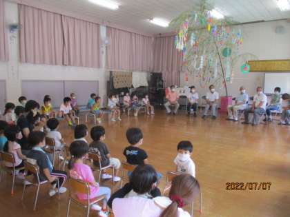 園長先生に七夕の由来をお話ししてもらい,なかよし会の方には「オカリナ」で