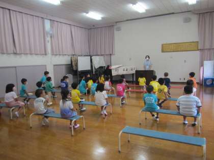 遊戯室で2学期の始業式を行いました。深草幼稚園の歌を歌い、園長先生のお話を聞きました。1学期の終業式で約束したことを思い出しながら、夏休みを振り返りました。「楽しいことが見つかった人?」という園長先生からの問いかけに、元気よく手を挙げる姿がありました。夏休みの思い出を糧に、2学期も元気に過ごしていきたいと思います。