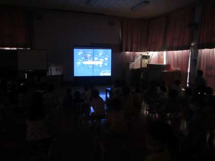 そしてお楽しみ、お月見映画館!「14匹のおつきみ」を見て、みんなで月の歌をうたいました。