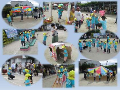 キレイな虹色のパラバルーンで、保護者の方と一緒に「にじのむこうに」で遊び、全員で玉入れ遊びをして盛りだくさんの運動会でした。