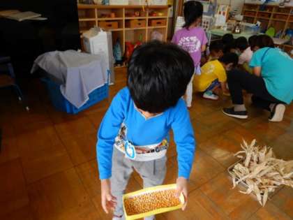 14日(金)のポップコーンパーティーに向けて、ポップコーンの皮をむいたりほぐしたりしました。ほぐすときには指先の力がいるのですが、手先を使って一生懸命ほぐしていました。
