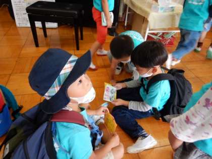 3歳児未就園ひよこ組、4歳児にじ組が降園する前、5歳児そら組みんなで、パーティのチケットを渡しにいきました。