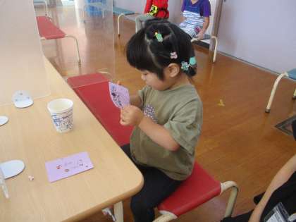 そら組さんにチケットをもらい、チケットに興味津々の子や、ポップコーンをおいしそうに頬張る姿も見られました。