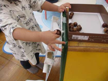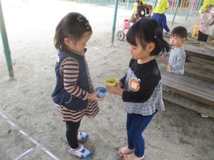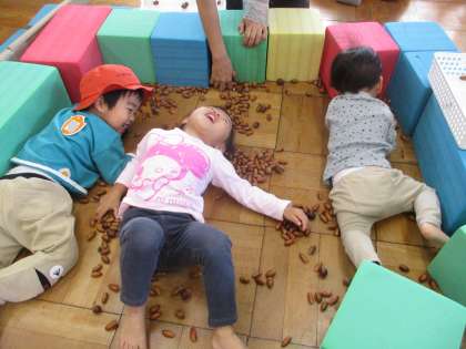 良いお天気の中、三輪車や砂場遊びを楽しんだり、保育室でたくさんのどんぐりで遊びました。