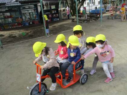新しい三輪車が登場した日は、みんな大喜びで園庭を駆け回りました。
