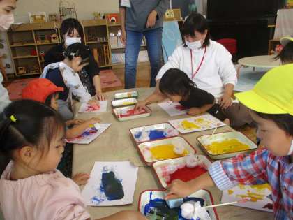 赤、青、黄色の絵の具をローラーでコロコロしたり、三角や四角の形のスタンプをして、