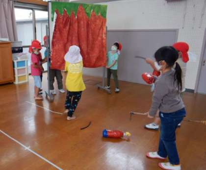 炎役、消防隊役など、子どもたちで遊びながら役割分担もしています。