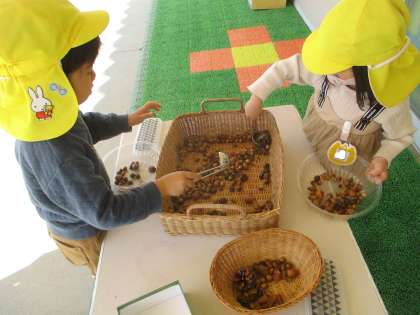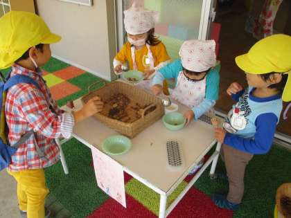 昨日の公園で拾ってきたどんぐりで、どんぐりご飯を作ったり、どんぐりをポップコーンに見立ててポップコーン屋さんをしたりして遊びました。