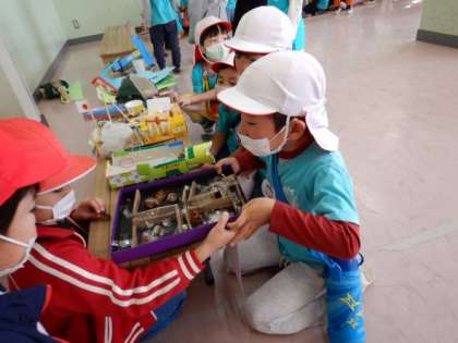 どんぐりこまやさん、どんぐりけんだまやさん、どんぐりずもうやさん、どんぐりや葉っぱつり屋さん・・・遊んでいくうちに、お店屋さんの小学生とのやりとりも自然と生まれてきました。