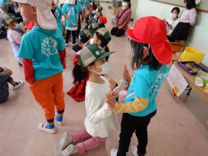 最初は、幼稚園、小学校両方がそれぞれ楽しんでいる♪動物園に行こうよ♪の遊びを楽しみました。体を動かすと、心もほぐれました。