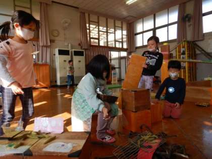 一斉活動では、生活グループで金づちと釘を使って、ドングリ転がしのコースをつくりました。最初は初めての金づちと釘にドキドキしている様子でしたが、釘を打っているうちにだんだん楽しくなっていきました。自分一人でつくるだけでなく、グループの友達とのやりとりも生まれていました。