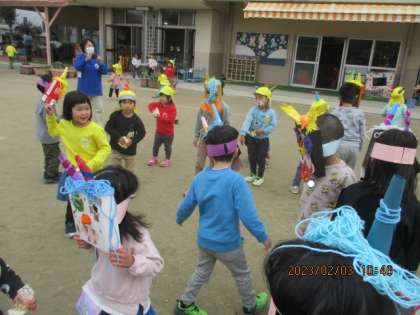 そして、子どもたちがつくった鬼の面をかぶり、園庭で元気に豆まきをしました。
