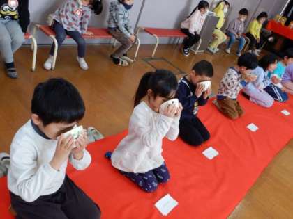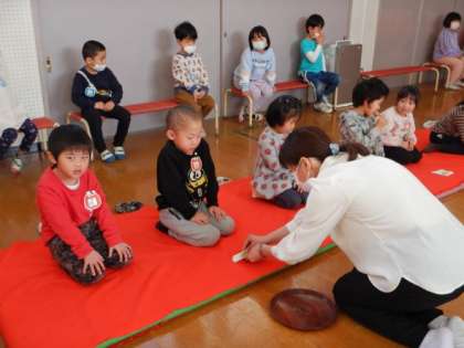 お菓子の“すはまだんご”をいただいた後のお抹茶は苦みもあったようですが、そんなことを感じさせない表情で背筋を伸ばして最後までお茶をいただく姿は、さすがもうすぐ1年生やそら組になる子どもたちだなと思いました。「少し苦かったけどおいしかった」と話したり、「お点前ちょうだいします」と保育室でも挨拶をしてみたりなど、子どもたちの心に残る経験となりました。