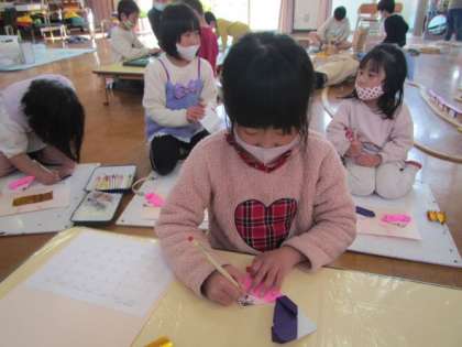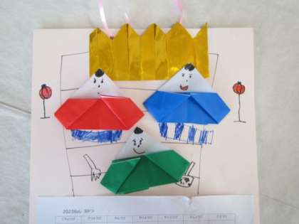 預かり保育で楽しんでいる「折り紙であそぼう・季節のカレンダーづくり」も3月で最後となり、今月は「ひな人形」を折りました。