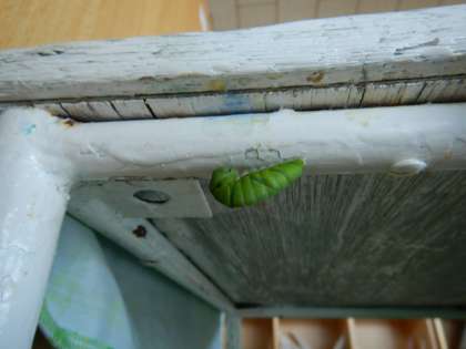 机の裏にくっついて、カラダをフリフリ、口から糸を出してさなぎになる準備中でした!