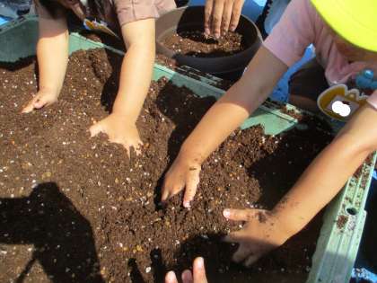 ふかふかの土を手ですくって、自分の植木鉢にふかふかベッドを作ります。