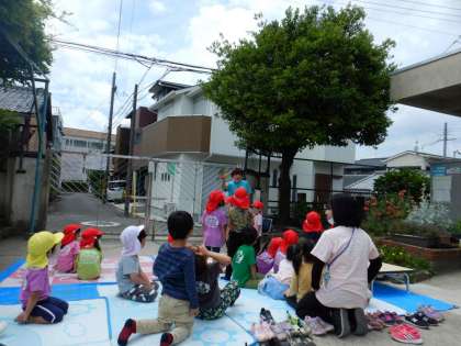 せっかく食べるなら、夏みかんの木の下で食べようと、園庭にシートを敷き、みんなで夏みかんの木の下に集まりました。まだ少し残っている夏みかんを探したり、アゲハ蝶が寄ってきている様子を見たりして、おやつを楽しみに待ちました。酸っぱい夏みかんが甘くなるようにと、みんなで気持ちを合わせて「おいしくな〜れ」とおまじないもかけました。