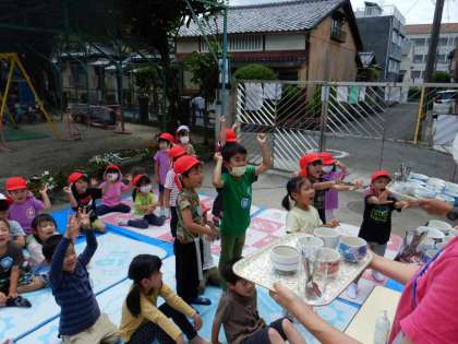 先日、幼稚園で収穫した夏みかんの皮を5歳児がむきました。そして、その夏みかんの皮で、今、色水遊びも楽しんでいます。出来上がった色水は、色だけでなく、「あぁ〜いいにおい〜」「おいしそう」と香りも味わっています。