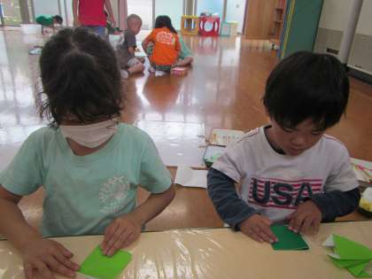 ちょっと難しいところもありましたが、折っていくうちに「あっ、この折り方風船の折り方に似てる」「かぶとにも似てるな」など、以前折ったことを思い出しながら折っていく子どももいました。