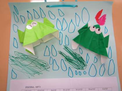 6月の折り紙遊びは園外保育でカエル『けろっぴ』との出会いもあったことから『カエル』を折ってみることにしました。