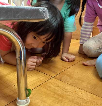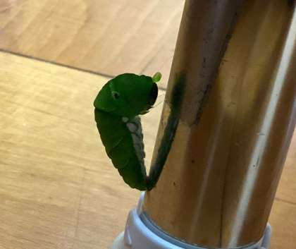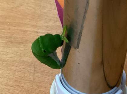 4歳児保育室の机の脚部分で、アオムシが蛹になりかけているのを発見!