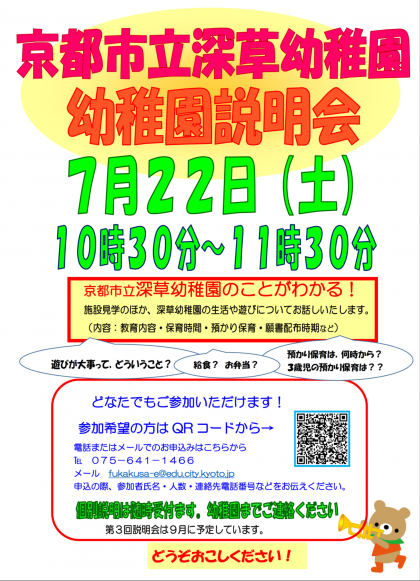 7月22日(土)に京都市立深草幼稚園説明会を行います。