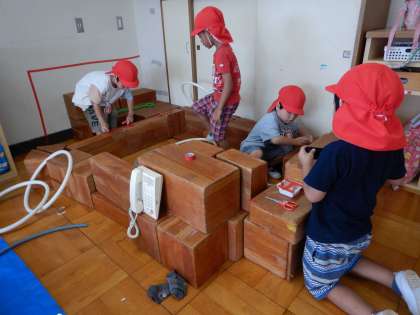 はしごも欲しい、と1階の遊戯室から重いはしごや大型積み木も運びました。
