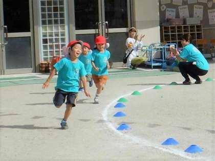 かけっこでは、にじ組もそら組も力いっぱいゴールをめざして走りきりました。