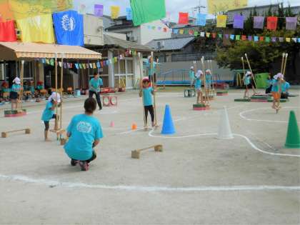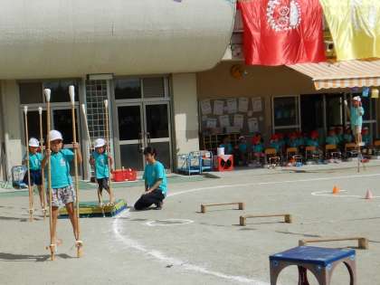 「そら組 チャレンジ!」では、5歳児が竹馬にチャレンジしました。親子でつくった大事な竹馬に乗って、トラックの周りを歩いたり、坂道や階段、得意技の披露など様々なコースに挑戦したりなど、自分なりのめあてをもって頑張りました。子どもたちは自信にあふれた表情で力を発揮していました。