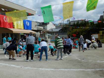 「みんなでいっしょに エイエイオー!」では、4・5歳児ペアの“幼稚園きょうだい”と、祖父母の皆様、ご来賓の皆様も一緒に玉入れをしました。にじ組、そら組、お客様と順に高くなるゴール杯に玉が入っていく様子を応援し合って楽しみました。参加いただいた皆様、子どもたちからのサフランのお土産もぜひお家で楽しんで育ててくださいね!