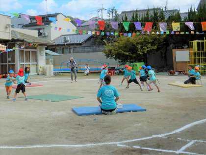 しっぽとりでは、そら組の子どもたちが3色のチームに分かれて3回戦を行いました。どのチームも相手のしっぽをねらって取りに行く真剣勝負でした。試合を重ねるごとに取れたしっぽが増えていくなど、あきらめずに最後まで戦いました。観客席からの応援も子どもたちの力になりました。