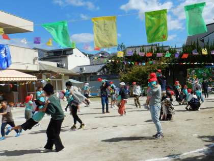 フィナーレでは、深草幼稚園の歌に合わせて、幼稚園きょうだい、そしてお家の人と一緒に踊りました。お家の人に抱きしめてもらったり、抱き上げてもらったりと、今日の頑張りをたくさん受け止めてもらい、幸せなひとときとなりました。