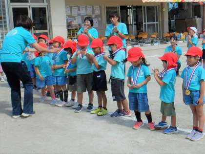 閉会式では、頑張った子どもたちに、園長先生からメダルをいただきました。一人一人かけてもらった胸に輝くメダルを見て、素敵な笑顔があふれました。今日1日、体を動かしてたくさん楽しんだね!一人一人が力を発揮して、本当によく頑張りました。最高の運動会でした!