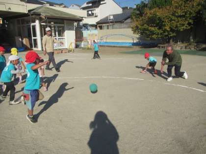 2回目となったボール遊びで「前にしたあれ…なんやったっけ…」「転がしドッチや」「今日もそれ(転がしドッチ)をするんかな?」となかよし会の方と一緒に遊ぶことを楽しみにしていた子どもたち。