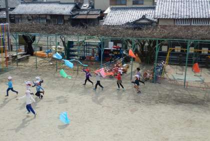 「できたから飛ばしてみよう!」と園庭に出て走ってみると、「飛んだ!」と大喜び。「なんかにじ組のときよりも重い感じがする」と、力を合わせてつくった大きな凧を感じる姿も見られました。寒さに負けず、凧揚げも楽しみたいと思います。