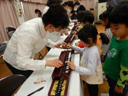 お茶をいただいた後は、そら組の子どもたちが大正琴の体験をさせていただきました。左手でボタンを押しながら右手に持ったピックで弦を弾き、音を鳴らすことを教えていただきました。ハンドベルで演奏していた「きらきら星」の音階を思い出しながら、演奏してみる子どももいました。