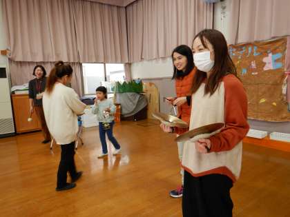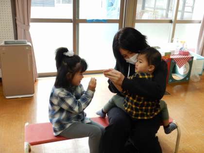 お家の人と一緒に歌を歌ったり、手遊びをしたり、親子で手をつないでスキップをして遊んだりなど、たくさん笑顔があふれていました。